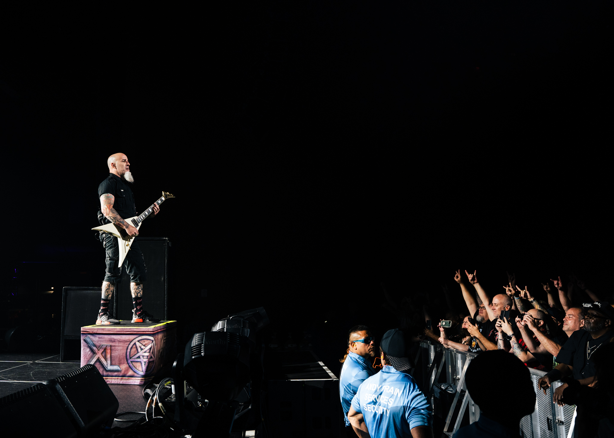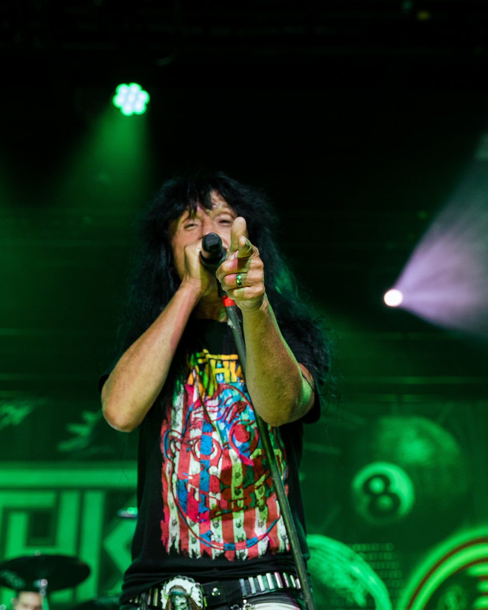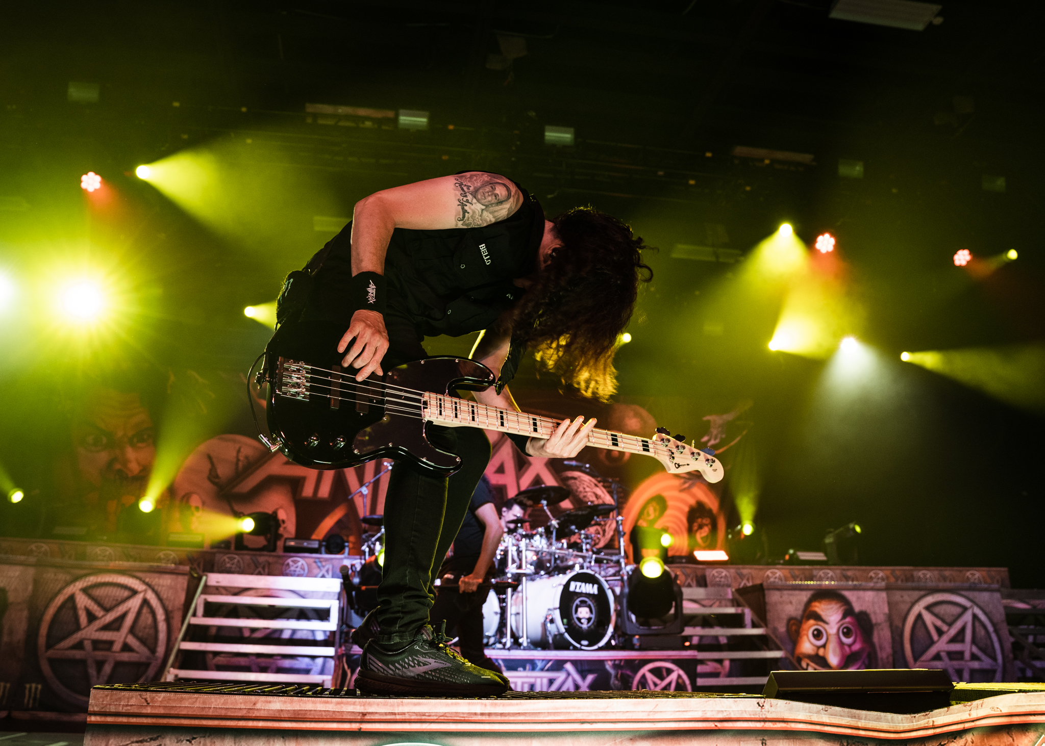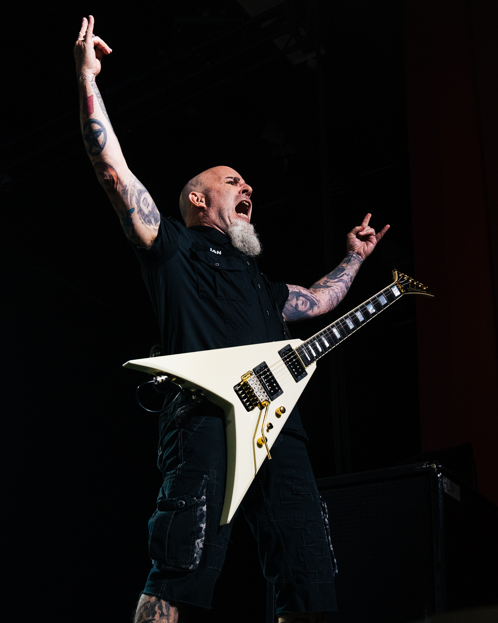 To finish the night of heavy distortion was none other than Anthrax, the thrash metal legends who helped bring in a new era of metal in the 1980’s filled with fast riffs and blaring vocals.This year they are celebrating their 40th anniversary (well 41st according to Scott Ian) and are making sure everyone remembers what they are all about. Before they play, a small video is displayed on a curtain blocking the stage that highlights all of their accomplishments and feats over the past forty years. This video includes music industry and metal veterans such as Dee Snider, Gene Simmons, John Carpenter, Chuck D and countless others who spoke about Anthrax’s legacy as one of the top bands of the last 40 years. As soon as the video ends after a supercut of all the guests saying the band’s name, the curtain is dropped to reveal the band members who immediately get to what they are best known for: fast riffs, pounding drums and screaming vocals from vocalist Joey Belladonna. While some may think that after forty years the band may not be able to match the high-intensity of years past, the band instantly proved any of those doubters wrong. Belladonna’s voice sounds as if it has not aged at all since the release of their debut album Fistful of Metal back in 1984. His screams were pitch perfect and filled with just as much volume as you would expect to hear on a studio recording from the 80’s. Guitarist, and founding member, Scott Ian hasn’t lost a step as well, he made sure to jump around on stage and pierce concert-goers souls as he would stare at them during intense moments of a song, making solid eye contact until he saw fit to resume running around on stage. Bassist Frank Bello would climb on top of platforms, towards the back of the stage, and strut from one side to the other as drummer Charlie Benante would pound away, keeping the band’s exhilarating tempo going. Lead guitarist Jon Donais would creep in the back until it was time to shred a solo, to which he would then prop a leg onto the front of the stage’s platforms and melt crowd members ears with fast-paced shredding that Anthrax is revered for. Ian talked to the crowd in Gary and spoke about how their first time playing in Indiana was at the now demolished Star Plaza Theatre in Merrillville, Indiana when they opened for KISS in 1988 and how that was a big tour for them at the time. Their setlist was filled with classic songs from their discography including “I am the Law,” “Cry For the Indians,” “Caught In A Mosh,” “Madhouse,” and even a recreation of “Bring the Noise” led by Scott Ian on vocals.