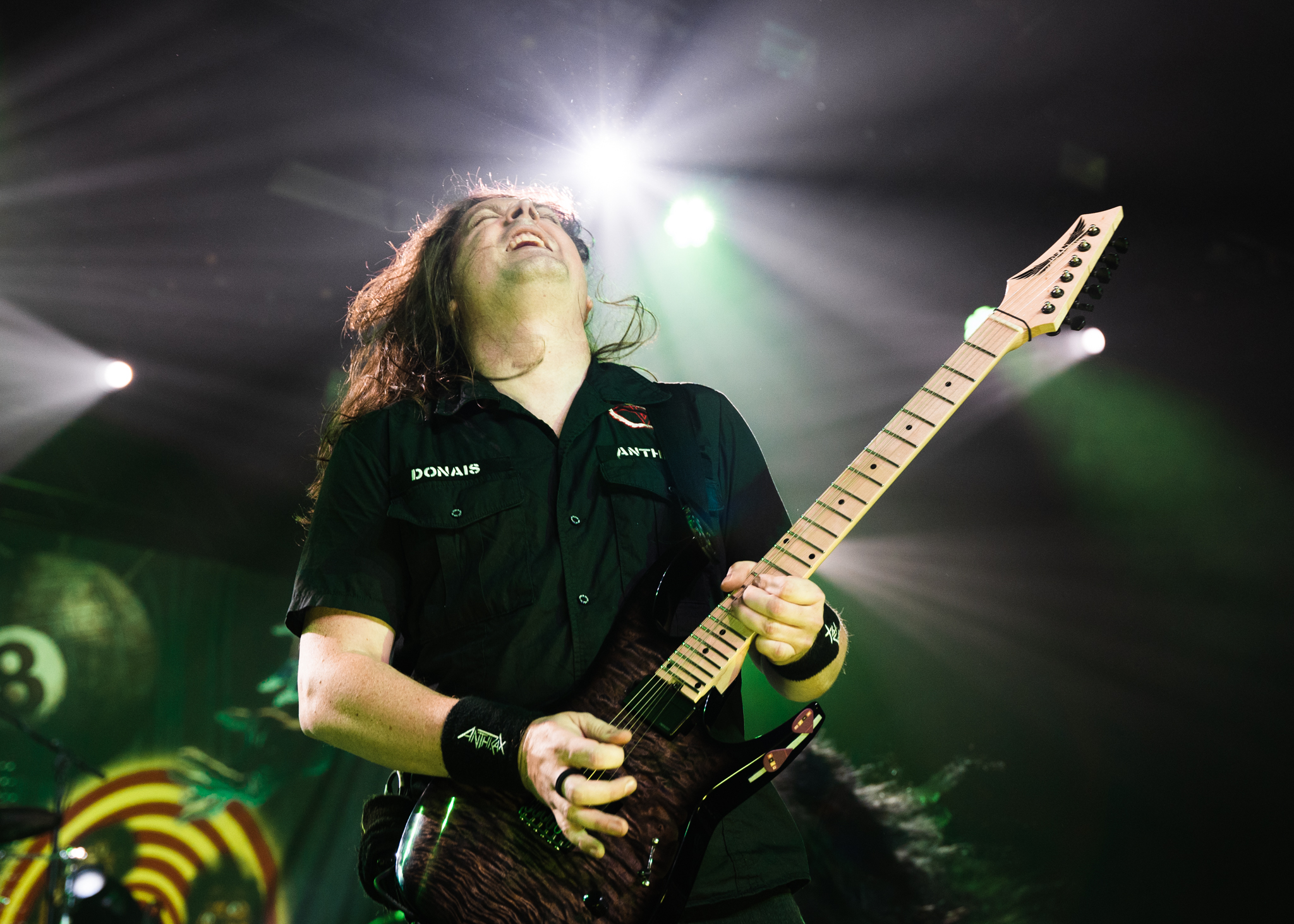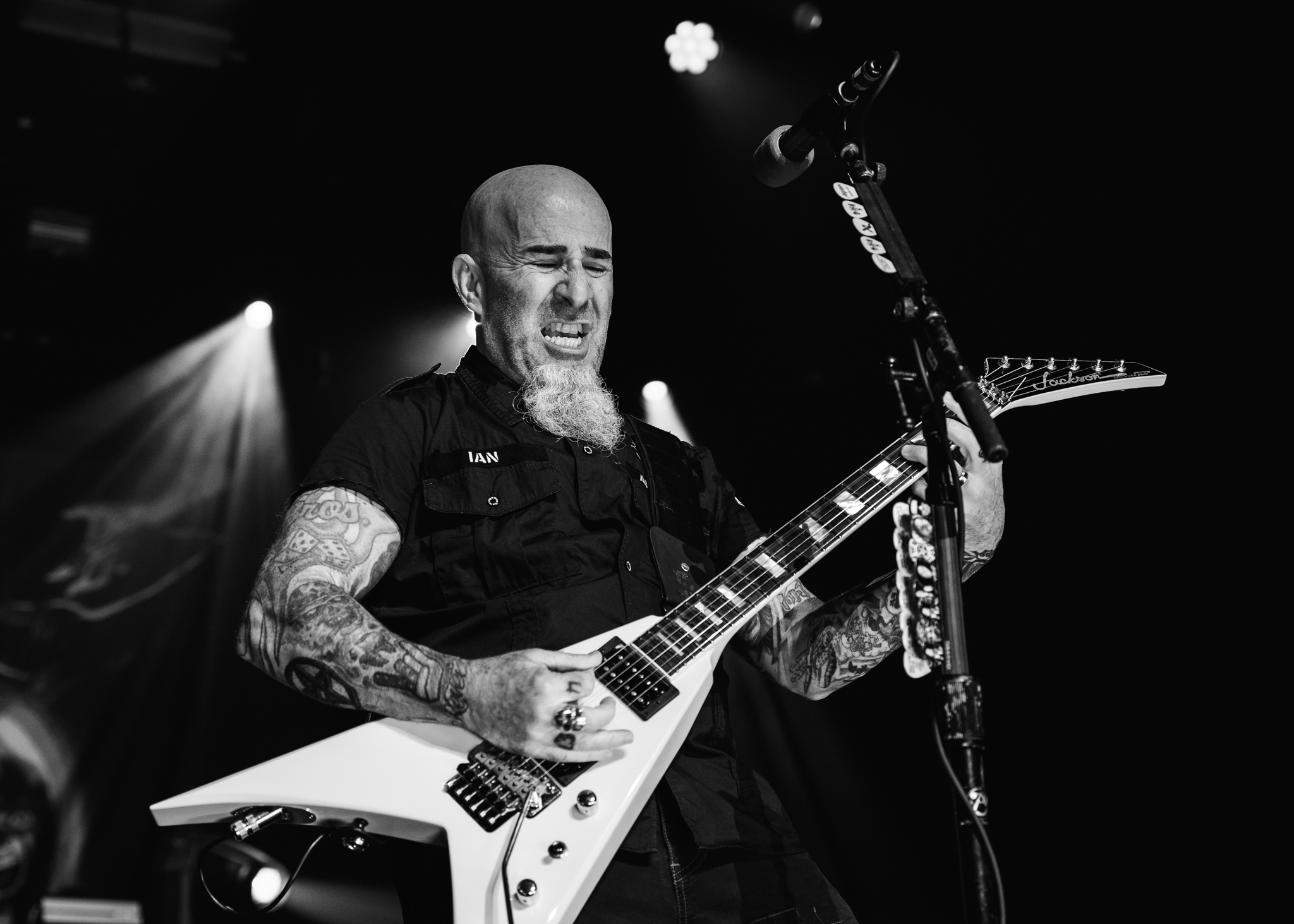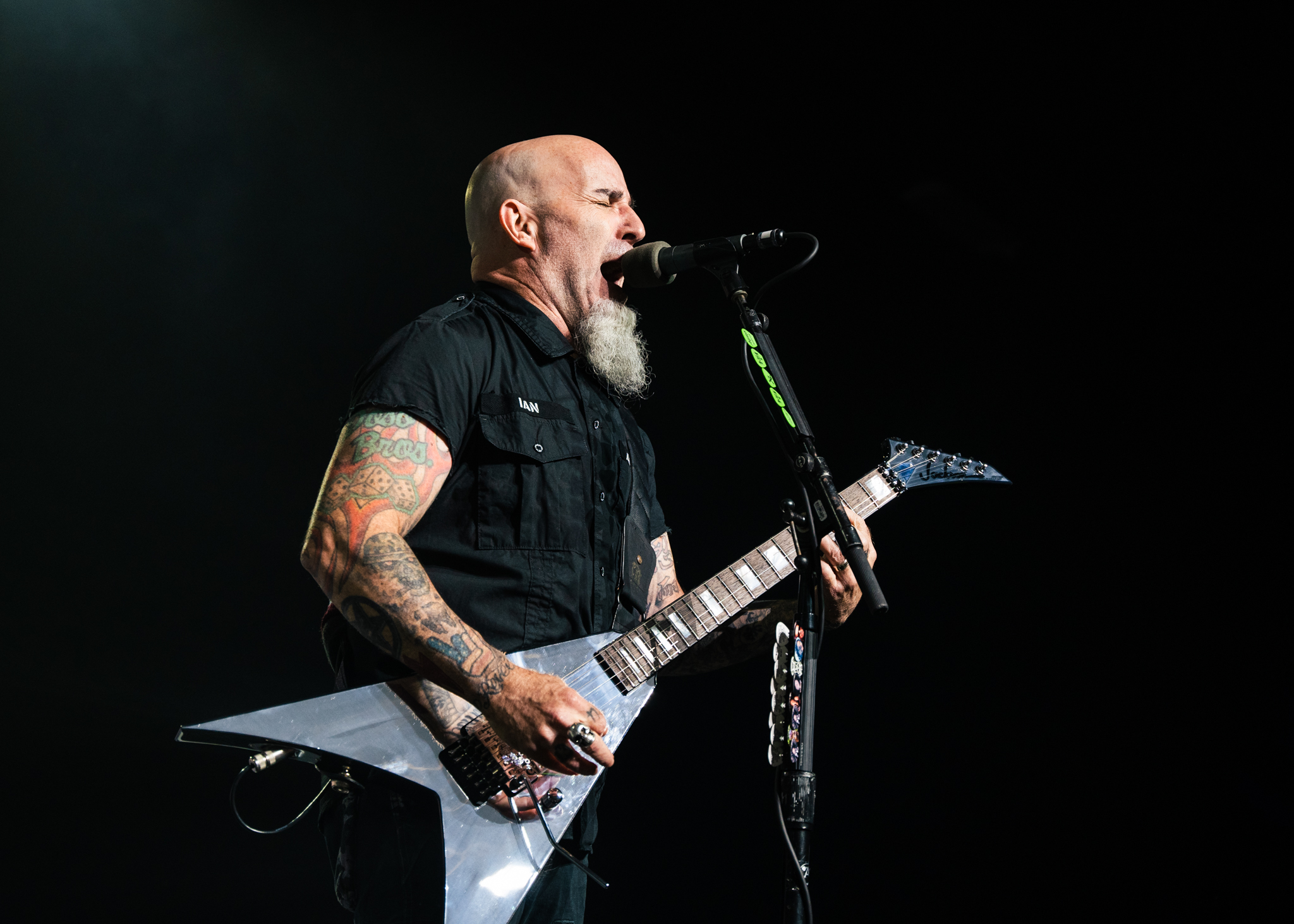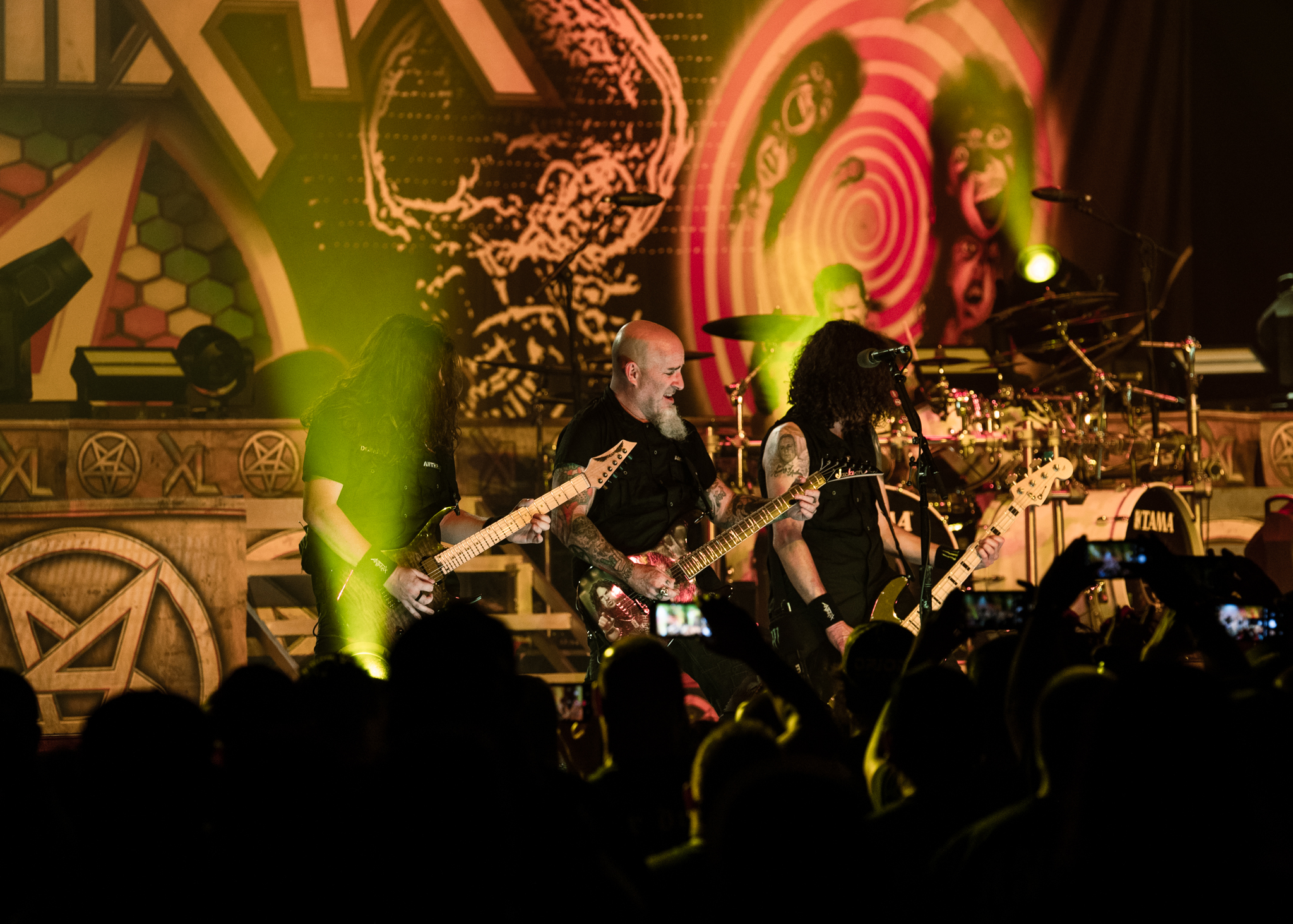 To finish the night of heavy distortion was none other than Anthrax, the thrash metal legends who helped bring in a new era of metal in the 1980’s filled with fast riffs and blaring vocals.This year they are celebrating their 40th anniversary (well 41st according to Scott Ian) and are making sure everyone remembers what they are all about. Before they play, a small video is displayed on a curtain blocking the stage that highlights all of their accomplishments and feats over the past forty years. This video includes music industry and metal veterans such as Dee Snider, Gene Simmons, John Carpenter, Chuck D and countless others who spoke about Anthrax’s legacy as one of the top bands of the last 40 years. As soon as the video ends after a supercut of all the guests saying the band’s name, the curtain is dropped to reveal the band members who immediately get to what they are best known for: fast riffs, pounding drums and screaming vocals from vocalist Joey Belladonna. While some may think that after forty years the band may not be able to match the high-intensity of years past, the band instantly proved any of those doubters wrong. Belladonna’s voice sounds as if it has not aged at all since the release of their debut album Fistful of Metal back in 1984. His screams were pitch perfect and filled with just as much volume as you would expect to hear on a studio recording from the 80’s. Guitarist, and founding member, Scott Ian hasn’t lost a step as well, he made sure to jump around on stage and pierce concert-goers souls as he would stare at them during intense moments of a song, making solid eye contact until he saw fit to resume running around on stage. Bassist Frank Bello would climb on top of platforms, towards the back of the stage, and strut from one side to the other as drummer Charlie Benante would pound away, keeping the band’s exhilarating tempo going. Lead guitarist Jon Donais would creep in the back until it was time to shred a solo, to which he would then prop a leg onto the front of the stage’s platforms and melt crowd members ears with fast-paced shredding that Anthrax is revered for. Ian talked to the crowd in Gary and spoke about how their first time playing in Indiana was at the now demolished Star Plaza Theatre in Merrillville, Indiana when they opened for KISS in 1988 and how that was a big tour for them at the time. Their setlist was filled with classic songs from their discography including “I am the Law,” “Cry For the Indians,” “Caught In A Mosh,” “Madhouse,” and even a recreation of “Bring the Noise” led by Scott Ian on vocals.