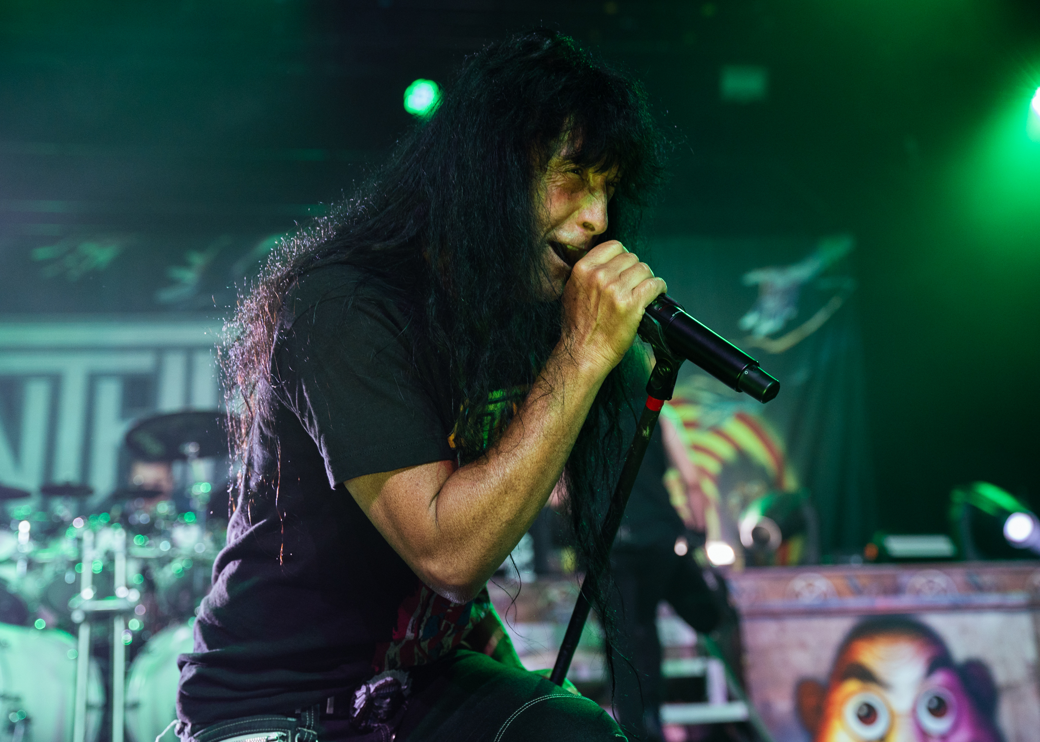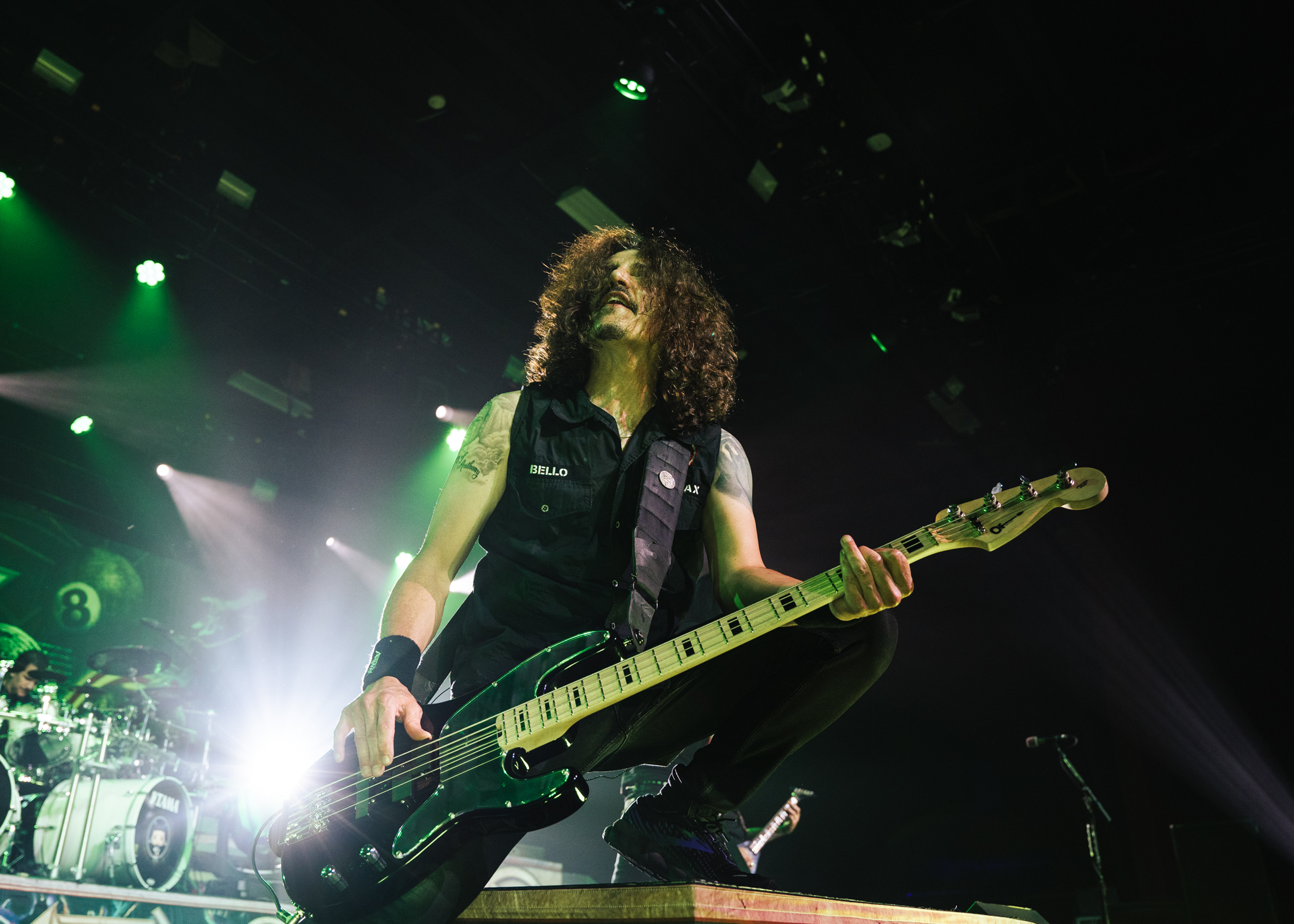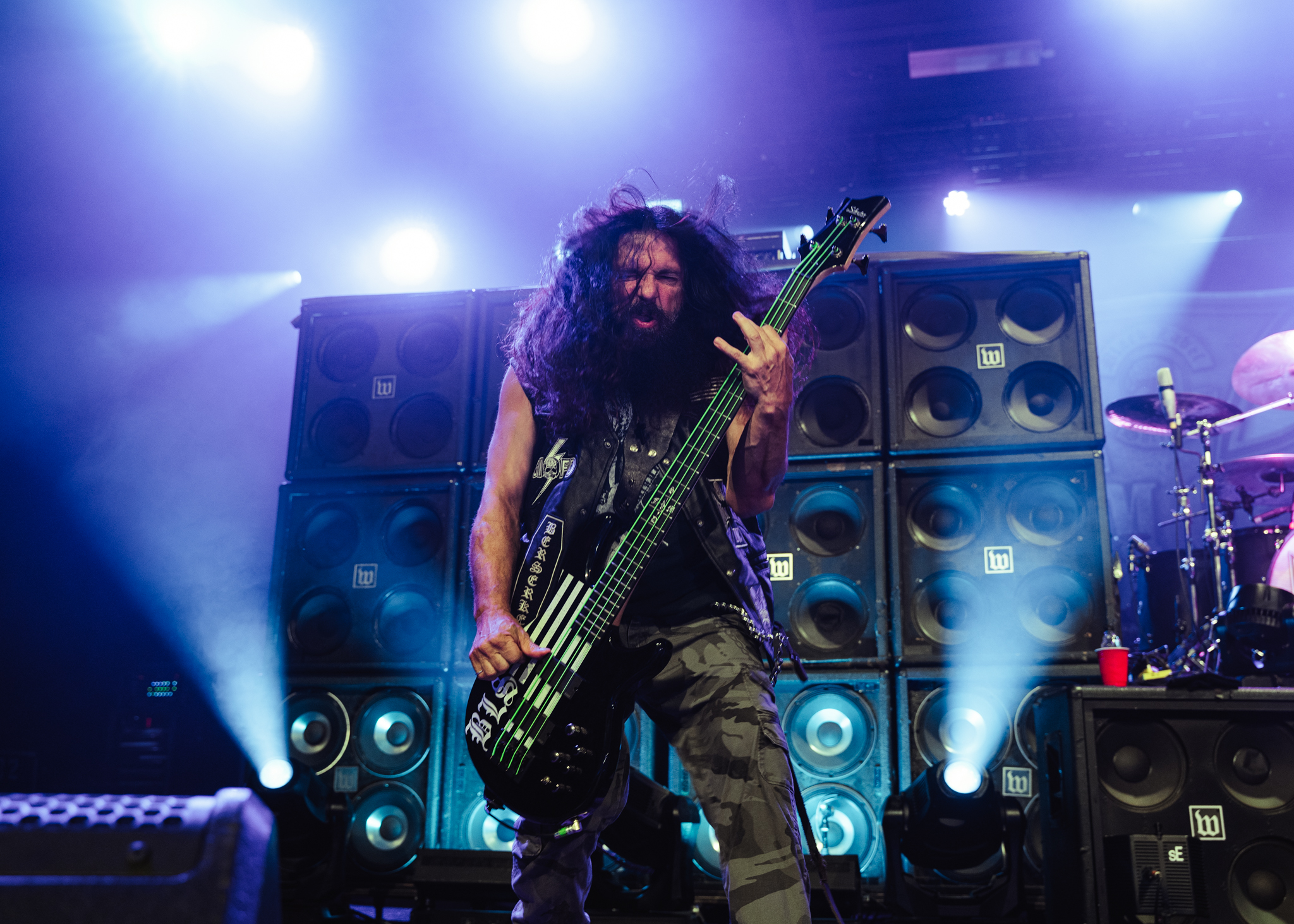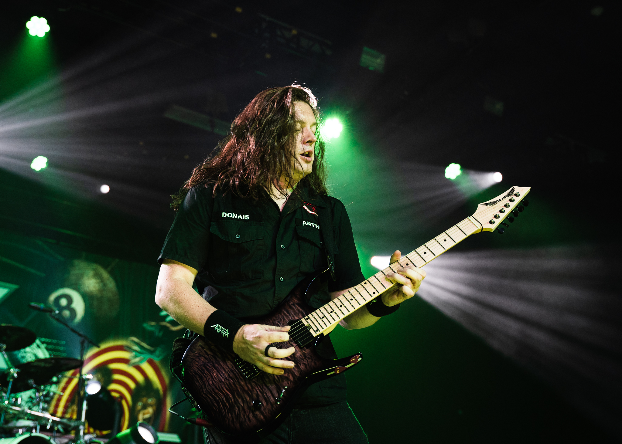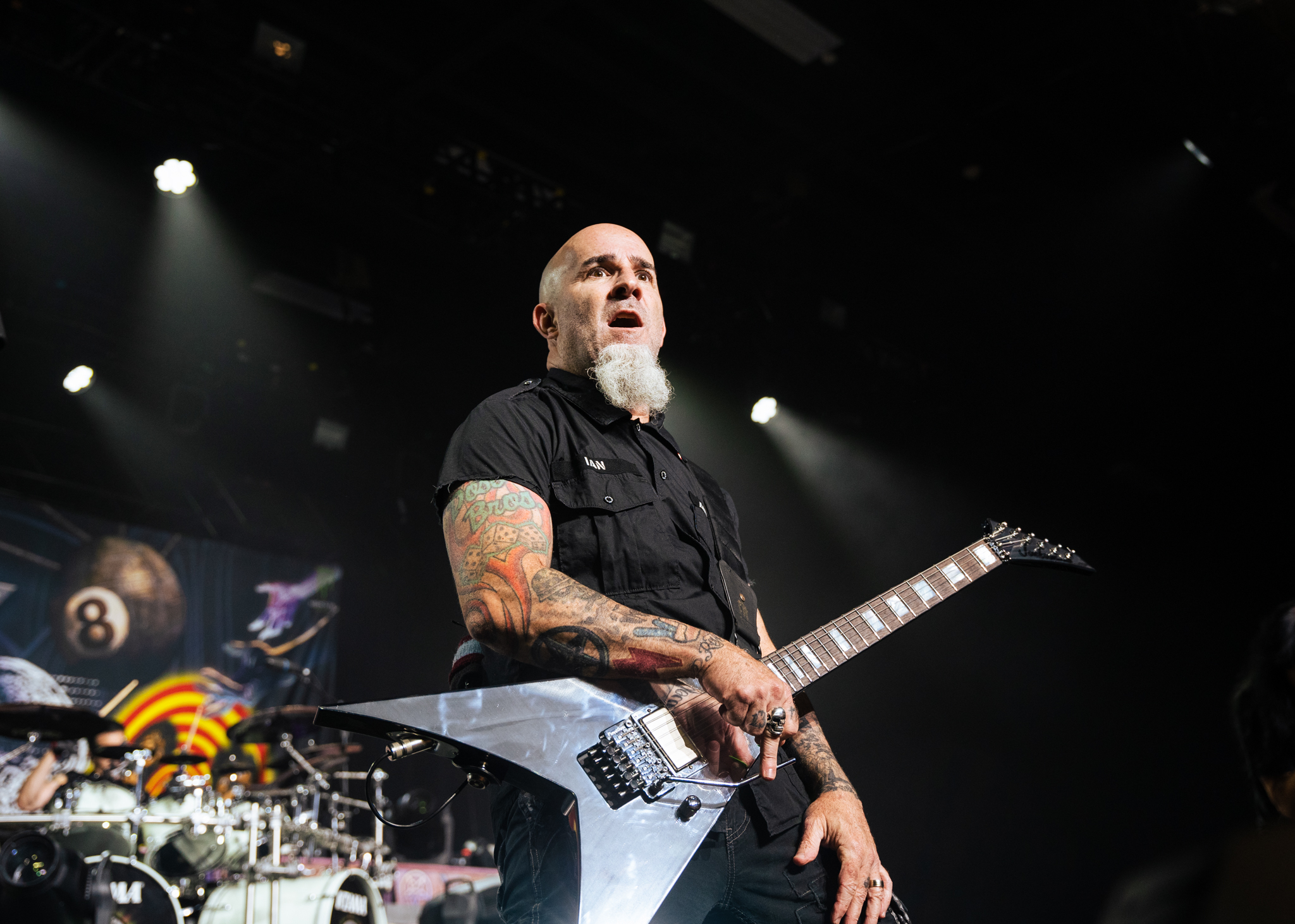 To finish the night of heavy distortion was none other than Anthrax, the thrash metal legends who helped bring in a new era of metal in the 1980’s filled with fast riffs and blaring vocals.This year they are celebrating their 40th anniversary (well 41st according to Scott Ian) and are making sure everyone remembers what they are all about. Before they play, a small video is displayed on a curtain blocking the stage that highlights all of their accomplishments and feats over the past forty years. This video includes music industry and metal veterans such as Dee Snider, Gene Simmons, John Carpenter, Chuck D and countless others who spoke about Anthrax’s legacy as one of the top bands of the last 40 years. As soon as the video ends after a supercut of all the guests saying the band’s name, the curtain is dropped to reveal the band members who immediately get to what they are best known for: fast riffs, pounding drums and screaming vocals from vocalist Joey Belladonna. While some may think that after forty years the band may not be able to match the high-intensity of years past, the band instantly proved any of those doubters wrong. Belladonna’s voice sounds as if it has not aged at all since the release of their debut album Fistful of Metal back in 1984. His screams were pitch perfect and filled with just as much volume as you would expect to hear on a studio recording from the 80’s. Guitarist, and founding member, Scott Ian hasn’t lost a step as well, he made sure to jump around on stage and pierce concert-goers souls as he would stare at them during intense moments of a song, making solid eye contact until he saw fit to resume running around on stage. Bassist Frank Bello would climb on top of platforms, towards the back of the stage, and strut from one side to the other as drummer Charlie Benante would pound away, keeping the band’s exhilarating tempo going. Lead guitarist Jon Donais would creep in the back until it was time to shred a solo, to which he would then prop a leg onto the front of the stage’s platforms and melt crowd members ears with fast-paced shredding that Anthrax is revered for. Ian talked to the crowd in Gary and spoke about how their first time playing in Indiana was at the now demolished Star Plaza Theatre in Merrillville, Indiana when they opened for KISS in 1988 and how that was a big tour for them at the time. Their setlist was filled with classic songs from their discography including “I am the Law,” “Cry For the Indians,” “Caught In A Mosh,” “Madhouse,” and even a recreation of “Bring the Noise” led by Scott Ian on vocals.