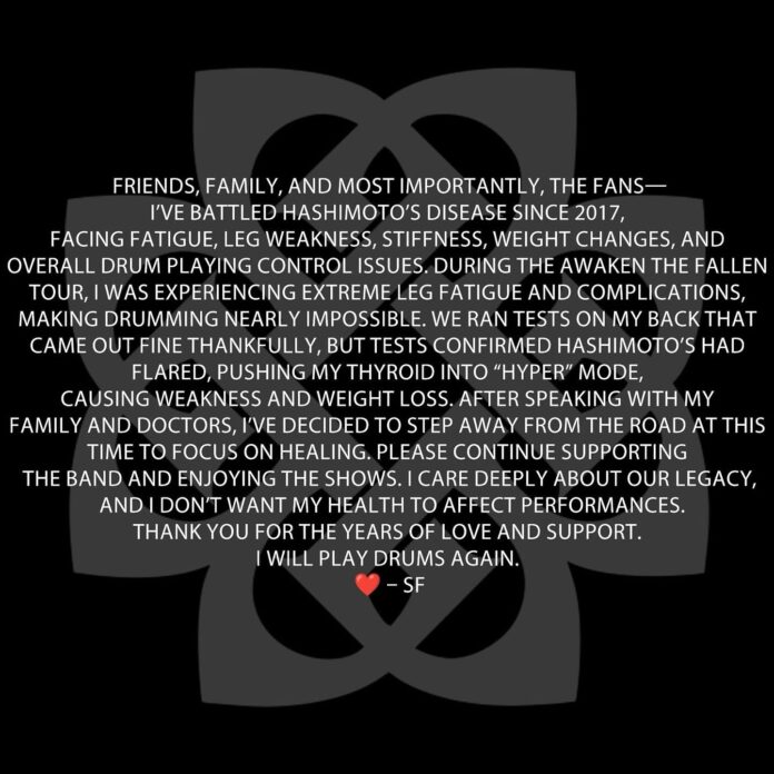“Friends, family, and most importantly, the fans— I’ve battled Hashimoto’s disease since 2017, facing fatigue, leg weakness, stiffness, weight changes, and overall drum playing control issues. During the Awaken the Fallen tour, I was experiencing extreme leg fatigue and complications, making drumming nearly impossible. We ran tests on my back that came out fine thankfully, but tests confirmed Hashimoto’s had flared, pushing my thyroid into ‘hyper’ mode, causing weakness and weight loss. After speaking with my family and doctors, I’ve decided to step away from the road at this time to focus on healing. Please continue supporting the band and enjoying the shows. I care deeply about our legacy, and I don’t want my health to affect performances. Thank you for the years of love and support. I will play drums again. ❤️ – SF”