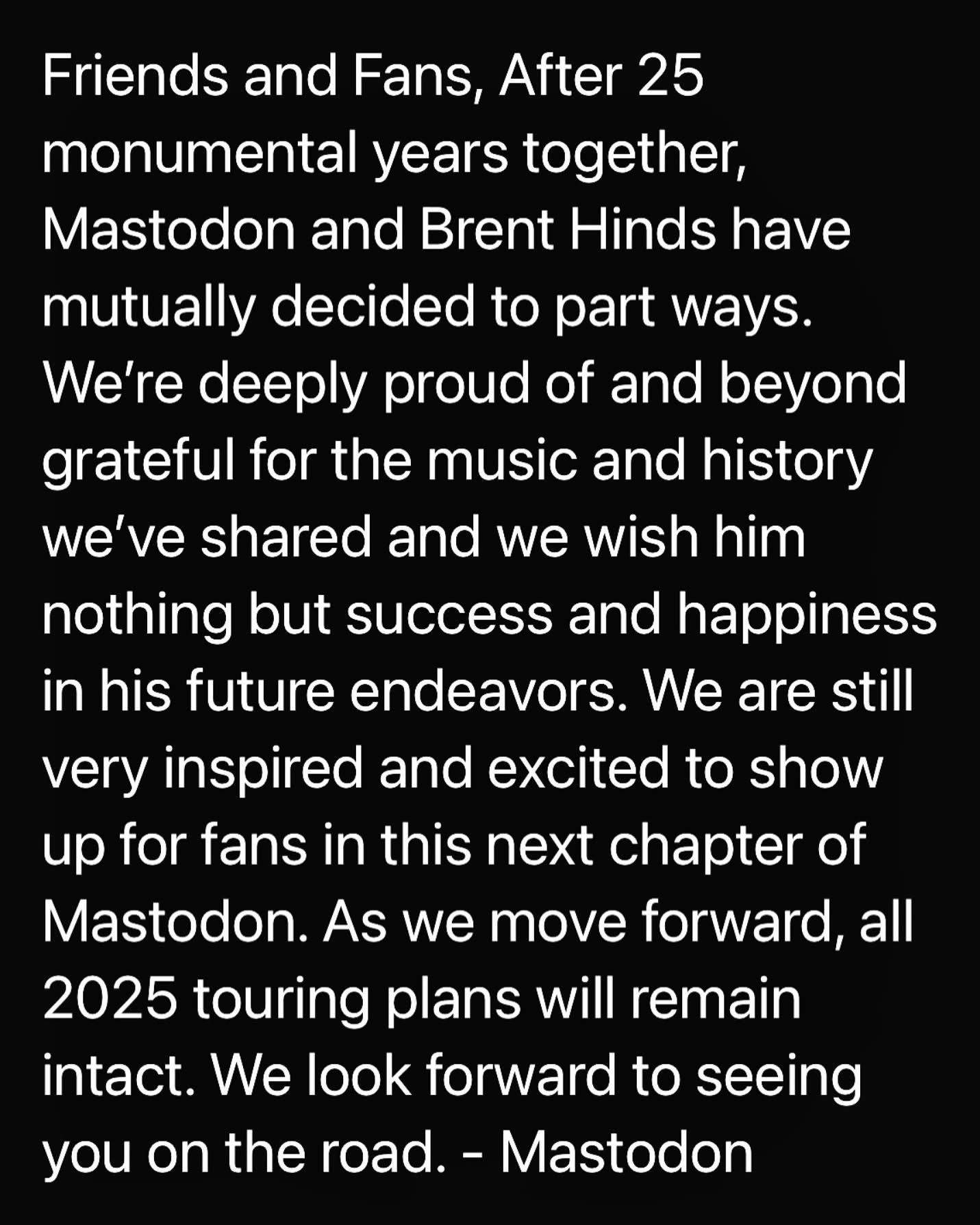 The statement, shared via the band’s official channels, expresses gratitude for Hinds’ contributions while reassuring fans that Mastodon will continue forward. “We’re deeply proud of and beyond grateful for the music and history we’ve shared, and we wish him nothing but success and happiness in his future endeavors,” the band wrote.