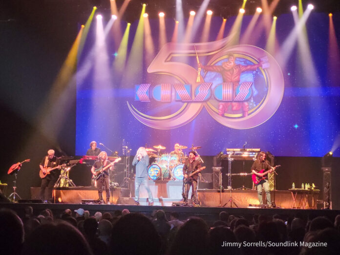 This band has a huge set up with 7 members on stage that includes Phil Ehart’s double kick bass on a beautiful baby blue kit. Tom Brislin (Meat Loaf, Yes, Patti Rothberg, Camel) has been with the band since 2018. He has at least 6 keyboards that I can see. They have a unique set up with no mic in center stage. Five of the seven members sang. The lead singer was behind a keyboard located beside the drummer for half of the songs. This venue is a seated auditorium so no one was standing. The venue holds 3,217 people. I estimate there were about 2,500 people in attendance. This is an older crowd which is to be expected with more than 50 years of music. My 11 year old son, Max, had to be one of the youngest in the audience.