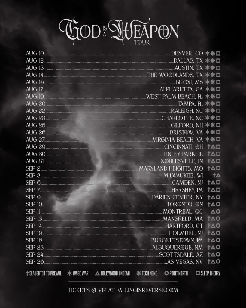 Metalcore powerhouse Falling In Reverse have announced they will be hitting North America with the “God Is A Weapon” Tour. Tour kicks off on August 10, 2025, in Denver, Colorado. The God Is A Weapon tour features special guests including Slaughter To Prevail, Wage War, Hollywood Undead, Tech N9ne, Sleep Theory, and Point North, rotating at select dates. Check a full list of dates below and check out their new single God is a Weapon featuring Marilyn Manson.