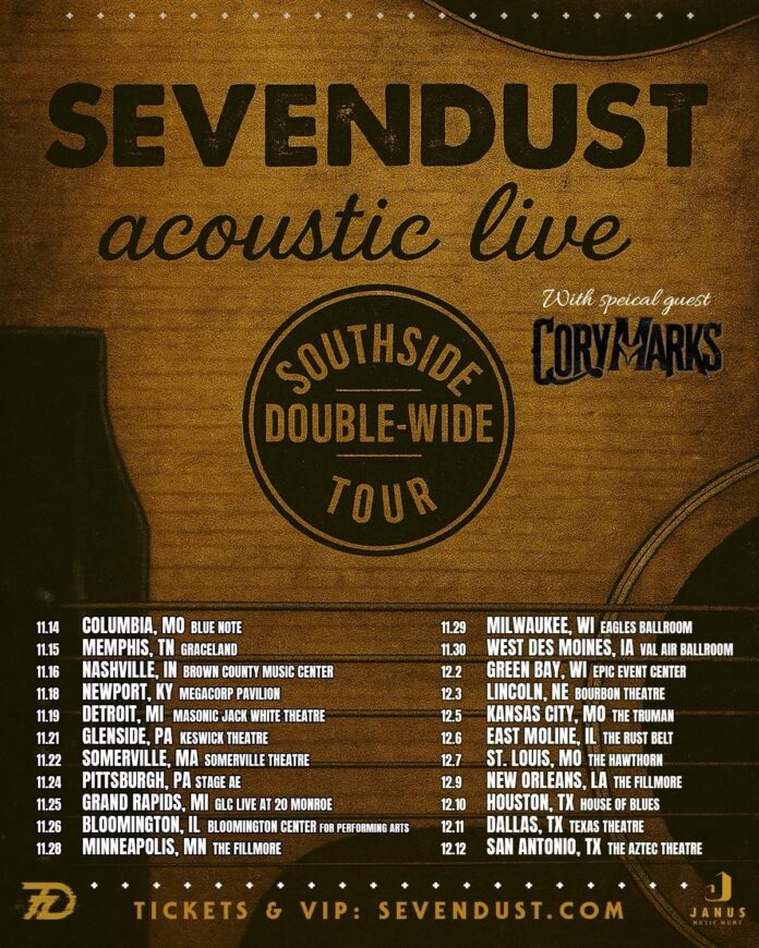 Sevendust is hitting the road this fall with a stripped-down twist on their signature sound. The iconic hard rock outfit has officially announced their Southside Double-Wide Acoustic Live Tour, bringing an intimate, unplugged experience to fans across the U.S. Joining them as special guest is country-rocker Cory Marks, who brings his own brand of southern grit and rock power to the tour.