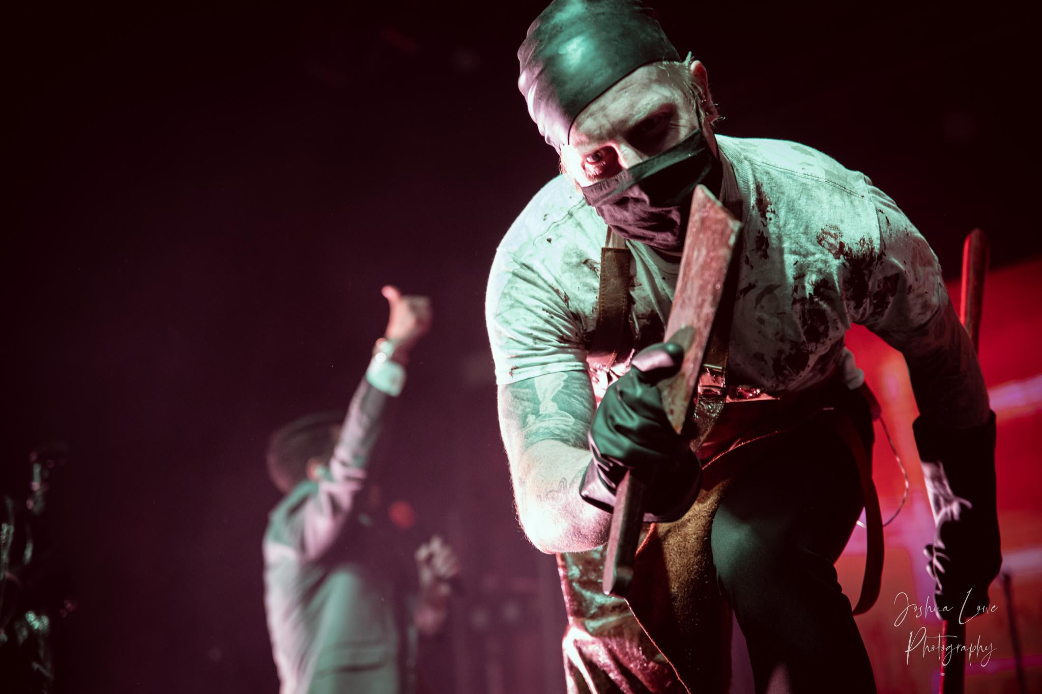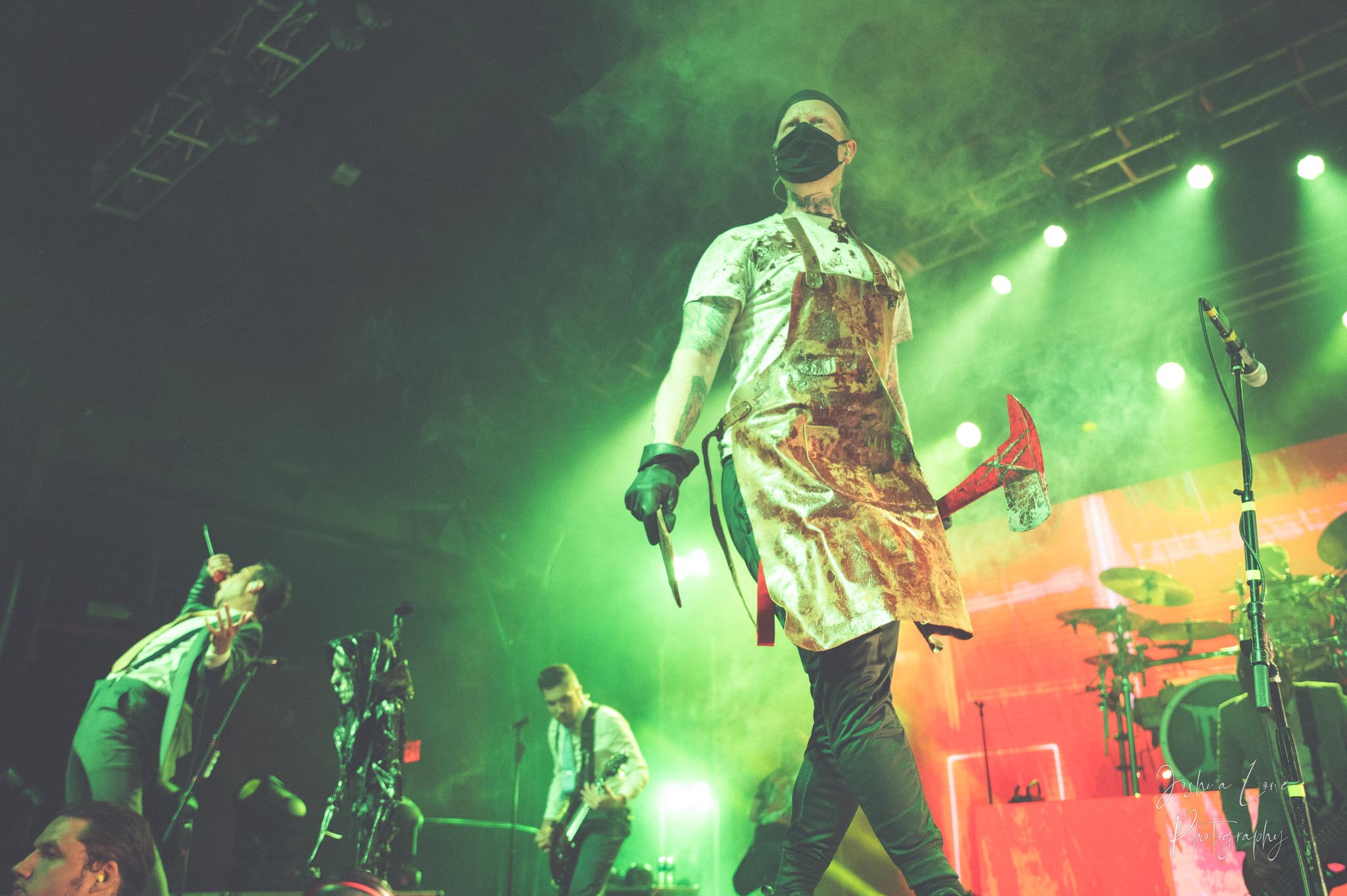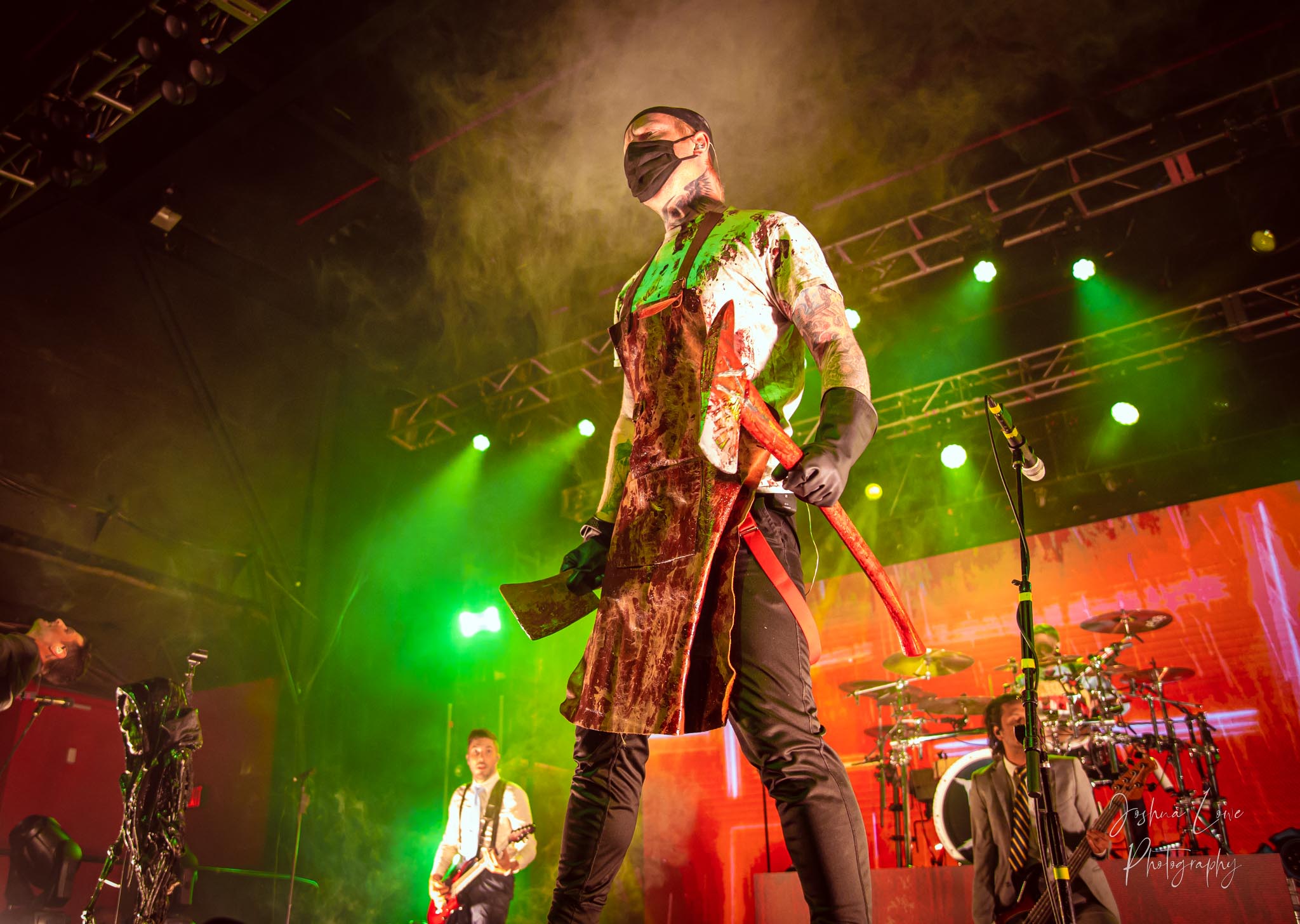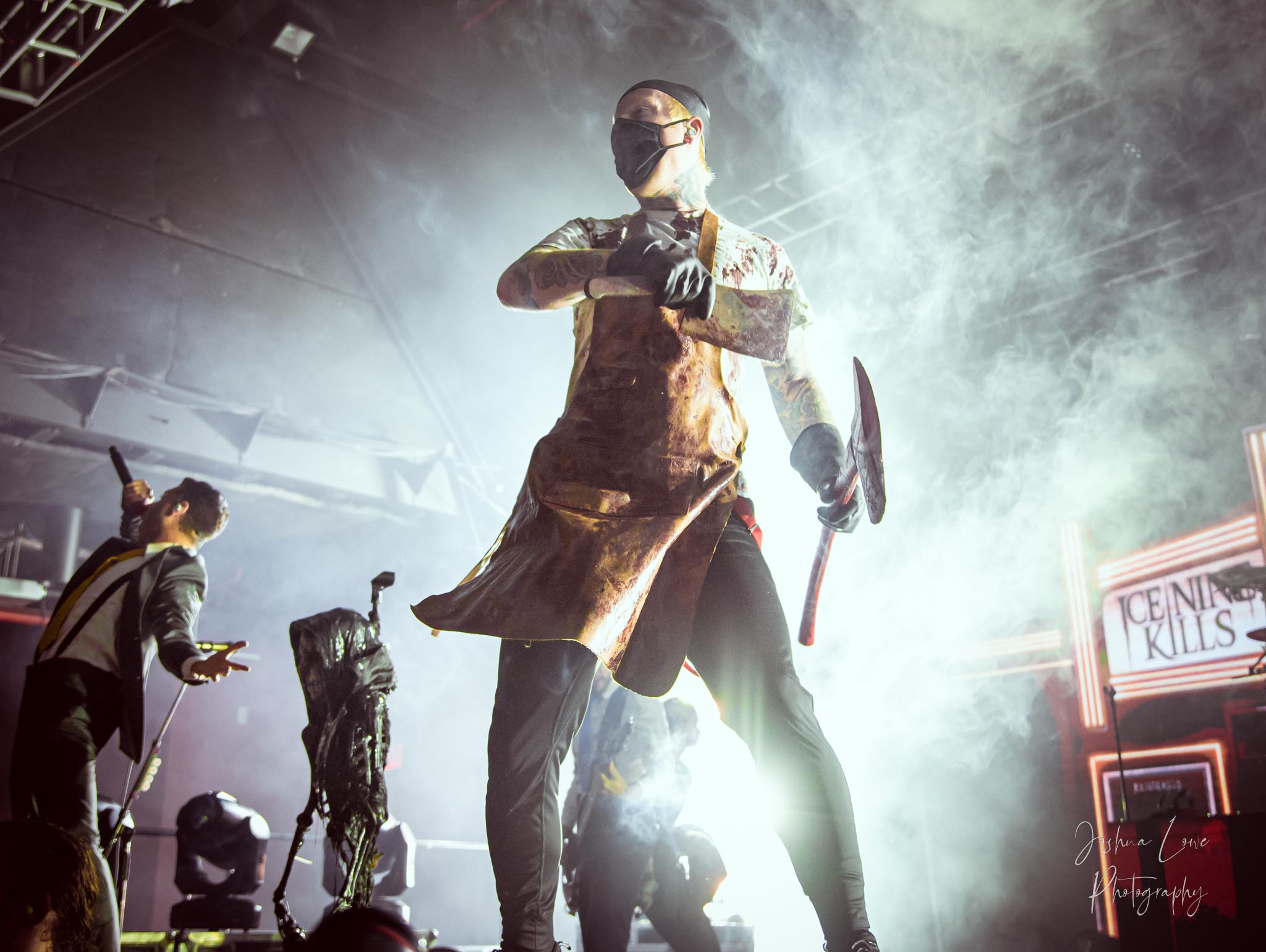 Ice Nine Kills was the last band to hit the stage in Charlotte North Carolina. One thing that caught my attention was the attention to detail INK puts in their show. For example, as any Ice Nine Kills fan would know INK front man Spencer Charnas is a MASSIVE scream fan. They have a song about Scream and you’ll see Ghostface on INK Merch as well. But one thing I noticed and knew the show was about to start, was behind bands before the lights went down. A song was playing over the speakers and any horror fan would recognize the tune, they my not recognize the artist, but they’d know the tune. It’s Nick Cave & The Bad Seeds: Red Right Hand. This song was featured in the original movie. Once the lights went out you hear the opening dialog from the band’s latest album going straight into the band’s title track from the album “Welcome to Horrorwood”. The night was filled with 12 horrifying tracks spanning across the band’s 3 albums.