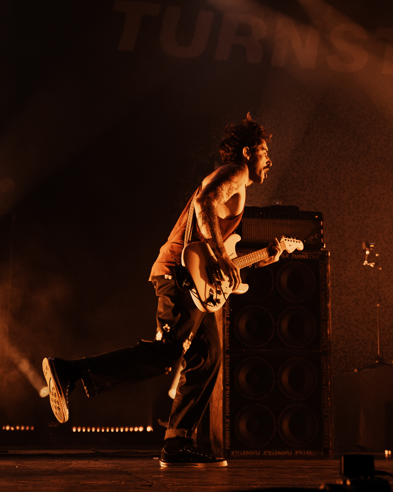 Their performance and approach to live music is also something to celebrate. While some bands seem bored and checked out while performing, the members of Turnstile ignore this concept and provide a memorable experience for fans in attendance. Vocalist Brendan Yates is known for leaping back and forth on stage while putting his all into his performance and his fellow bandmates also deliver passionate performances to drive the crowd into frenzy while screaming and moshing to the beat of the band’s fun and engaging set. Turnstile even stops at a certain point to provide water for the crowd members by throwing water bottles from the stage and instructing the crowd to stay hydrated. The band truly tries to connect with every fan and ensure that the crowd is having an excellent time. Even when they played some of the band’s slower songs such as “ALIEN LOVE CALL” the lyrics were belted by all in attendance in one harmonious voice, amplifying the Turnstile Love Connection slogan even more.