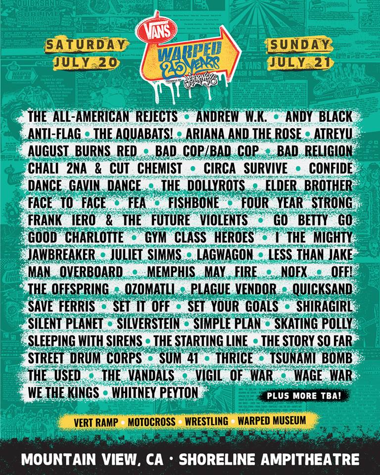“Through the years the Vans Warped tour has always tried to bring you something extra, this year we have gone through the past archives and dug up many of our old friends to join us for these special events.” says producer Kevin Lyman. “The curated art experience will showcase our favorite moments over the last 25 years. So, dust off the old Vans and lace em’ up since you won’t want to miss a thing!”